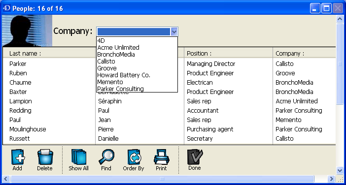 The control buttons have been placed in the footer area and a custom picture has been placed in the header area. The Header area also includes a drop-down list that lets you select the company whose employees you want to display.