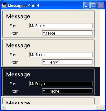 Here is an example of an output form for a phone message management database which uses two lines per record: