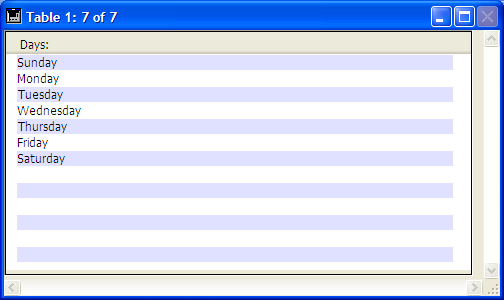 An output form has standard horizontal and vertical scroll bars. You can scroll records by clicking either of the scroll arrows, clicking the scroll bar, or dragging the scroll box. You can also use the PgUp and PgDn keys (to scroll through the list of records one screen “page” at a time) or the Start and End keys (to go directly to the start or end of the list).