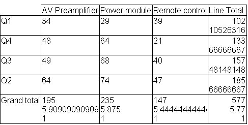 This mode allows you to display your report as a two-dimensional table. This is useful when you want to display data from one data source broken down into categories that are actually a function of two other data sources. For example, a cross-table form would let you display, in a table, how many of each product type was sold in each quarter. The following is a typical Cross-table type quick report: