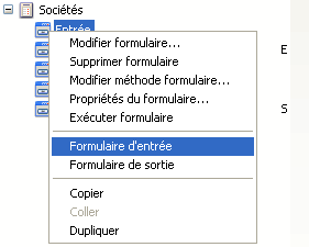Vous pouvez désigner les formulaires d’entrée et de sortie courants pour chaque table depuis l’Explorateur (formulaires table uniquement). Pour cela, cliquez sur le nom du formulaire table souhaité puis utilisez les commandes Formulaire d’entrée ou Formulaire de sortie du menu contextuel :