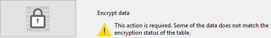 Abra a página de cifrado de CSM. Se abrir a página sem configurar nenhuma tabela como Encriptável, se mostrará a mensagem abaixo na página: Do contrário, se mostra a seguinte mensagem: Isto significa que o estado Encriptável de ao menos uma tabela foi modificado e o arquivo de dados ainda não foi criptografado. Nota: a mesma mensagem é mostrada quando o estado Encriptable tiver sido modificado em um arquivo de dados já cifrado ou depois de que o arquivo de dados tiver sido descifrado (ver abaixo).