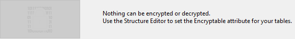 Nota: Esta operação modifica o estado Encryptable de suas tabelas. Quando o arquivo de dados for descriptografado, o estado de criptografia das tabelas não correspondem aos atributos de Criptografia. Para restaurar o estado de correspondência, deve desselecionar todos os atributos Encryptable no nível da estrutura do banco de dados.
