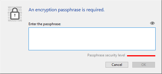 Clique no botão Encriptar imagem. Se lhe pedirá que ingresse uma senha para seu arquivo de dados: A frase passe de senha se utiliza para gerar a chave de cifrado de dados. Uma frase passe de senha é uma versão mais segura que uma senha normal e pode conter uma grande qantidade de caracteres. Por exemplo, pode ingresar uma frase passe de senha como "Todos viemos a Montreau!" ou "Minha primeira frase de senha!" O indicador de nivel de segurança pode ajudar a avaliar a força de sua frase passe: (Verde escuro é o nivel mais alto)
