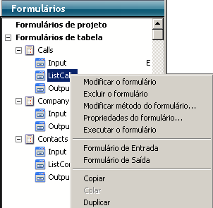 Pode atribuir os formulários de entrada e de saída atuais para cada tabela desde o Explorador (formulários de tabela unicamente). Para fazer isso, clique no nome do formulário de tabela e utilize os comandos Formulário de entrada ou Formulário de saida do menu contextual: