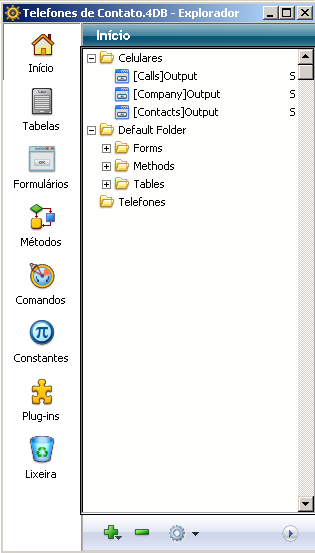 Nesta página, pode adicionar pastas e sub-pastas, renomear, mover e reorganizar pastas e objetos. Também pode criar diretamente tabelas, formulários e métodos de projeto. Como nas outras páginas do Explorador, pode abrir uma tabela, um formulário ou um método de projeto em uma janela do editor correspondente com um duplo clique em seu nome, ou inserir o nome utilizando arrastar e soltar. Por último, pode renomear ou apagar pastas e objetos. Também é possível atribuir uma pasta a um objeto no momento de sua criação.