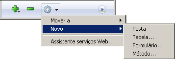 O comando Novo> da página Início permite criar não apenas as pastas, mas também tabelas, formulários e métodos de projeto.  Quando escolher um subcomando deste tipo, vá diretamente à caixa de diálogo de criação do objeto.