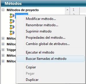Puede buscar desde el Explorador la lista de objetos que referencian un método de proyecto (otros métodos o menús). Esta función está disponible vía el comando Buscar llamadas al método en el menú contextual o en el menú opciones de la página: