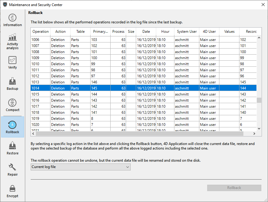 Assim é como funciona a função retroceder: quando o usuário clique no botão Voltar atrás, 4D fecha o banco atual e restaura o último backup de dados do banco. O banco restaurado se abre e 4D integra as operações do histórico até a operação selecionada. Se o banco não for guardado, 4D parte de um arquivo de dados vazio.