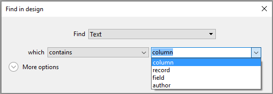 • contains: Searches all text in the Design environment for the specified string. Search results for "var" can include "myvar", "variable1" or "aVariable".