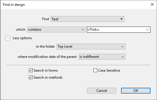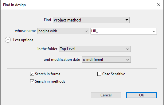 • Language expression: Used to search for any valid 4D expression; the search is performed in the "contains" search mode. Validity is important because 4D must be able to evaluate an expression to be able to search for it. For example, a search for "[clients" (invalid expression) will not return any result whereas "[clients]" is correct.