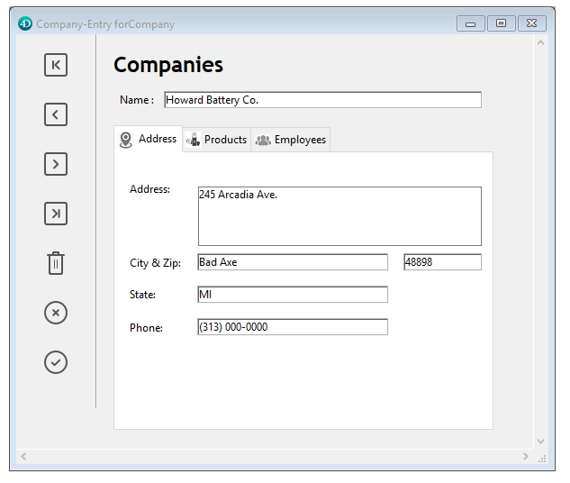 Puede asociar la acción Ir a la página a una pestaña. Cuando esta acción está activa, 4D muestra automáticamente la página del formulario que corresponde al número de la pestaña seleccionada.