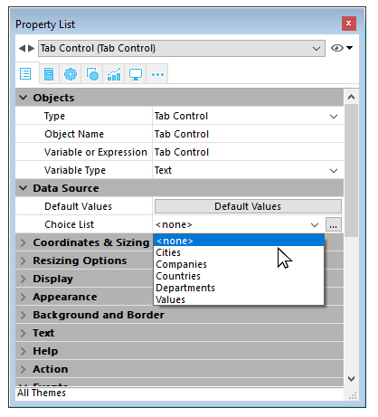 La orientación de las pestañas se define en el tema “Apariencia” de la Lista de propiedades.