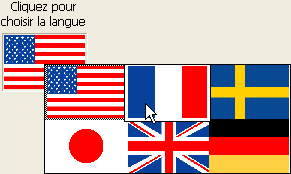 Pour créer un pop-up menu image, vous devez faire référence à une image conçue dans ce but. Pour reprendre l’exemple utilisé dans la description des Boutons image, imaginons que vous souhaitiez permettre à l’utilisateur de sélectionner la langue d’interface de l’application à l’aide d’un pop-up menu image.