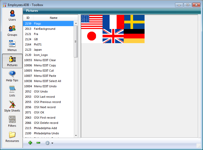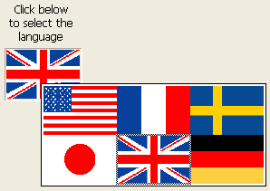 Um ein PopUp-Menü Bild zu erzeugen, müssen Sie sich auf ein Bild beziehen. Das folgende Beispiel verwendet das Bild, das für Bildschaltflächen definiert wurde (siehe Bildschaltflächen). Hier können Sie die jeweilige Sprache für die Oberfläche aus einem PopUp-Menü Bild auswählen.