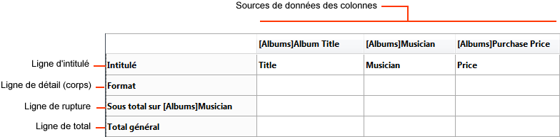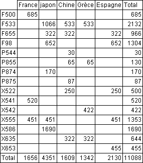 Ce mode vous permet de concevoir des états sous forme de tableaux à deux dimensions. Ce type d’état est utile lorsque vous souhaitez afficher des données divisées en catégories, elles-mêmes fonction de deux autres sources de données. Par exemple, si vous vendez différents produits dans plusieurs pays, un état en tableau croisé vous permettra d’afficher les ventes par pays et par produit. Voici un exemple d’état en tableau croisé :