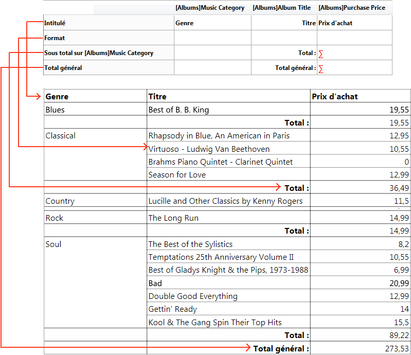 Il s’agit du mode par défaut. Dans ce mode, les états affichent typiquement les enregistrements sous forme de listes avec ruptures et calculs récapitulatifs. Voici un exemple d’état en liste :