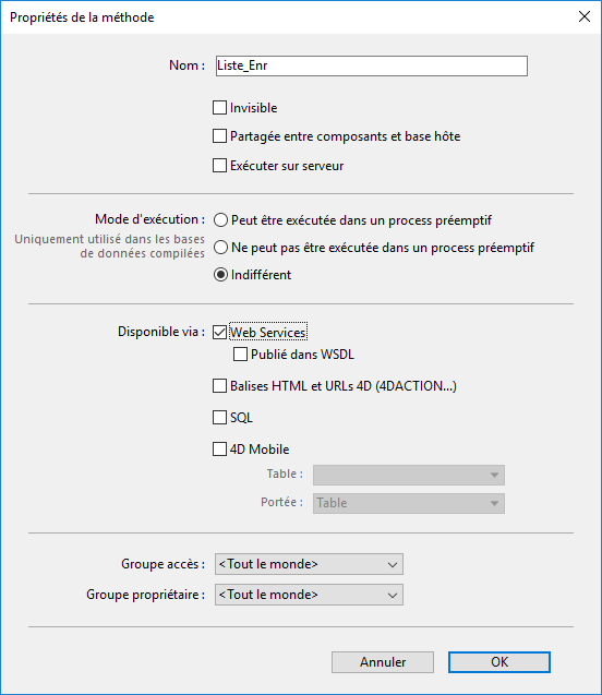 Vous pouvez décider de publier n’importe quelle méthode projet en tant que Service Web, sans modification majeure. La publication est une propriété de la méthode :