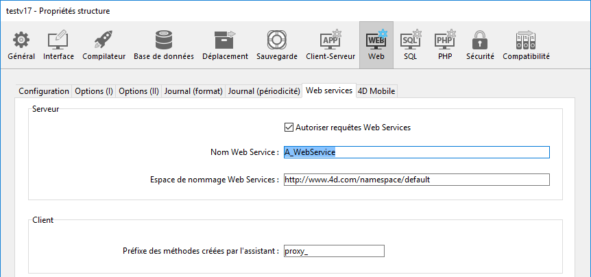 La page Web services des Propriétés de la base (thème “Web”) permet de définir des paramètres généraux concernant la publication et l’utilisation de Services Web :