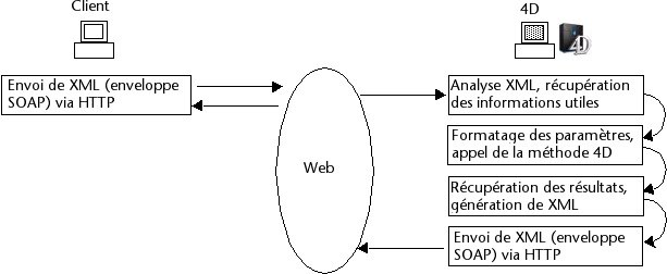 Le serveur Web de 4D prend automatiquement en charge la gestion du service ainsi que la publication et la maintenance du fichier WSDL. L’analyse du contenu XML des requêtes, le formatage des paramètres, le renvoi des résultats, etc., sont effectués par 4D sans qu’aucune programmation spécifique ne soit nécessaire.