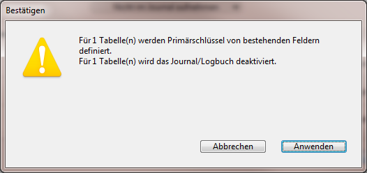 ![]() | Warnung | Die Tabelle hat keinen Primärschlüssel, wird aber auch nicht protokolliert, d.h. die Option "Benutze Logbuch" ist für die Tabelle deaktiviert. Um Tabellen mit diesem Status auszublenden, können auf Sie auf das Icon für Warnungen klicken. |