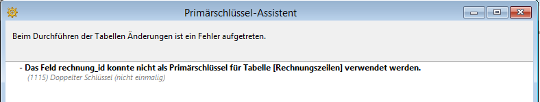 ![]() | Kein Primärschlüssel, kein Feld auswählbar | Die Tabelle hat keinen Primärschlüssel und hat keine Felder, die sich dafür eignen. Sie müssen selbst ein Feld mit Primärschlüssel anlegen. |