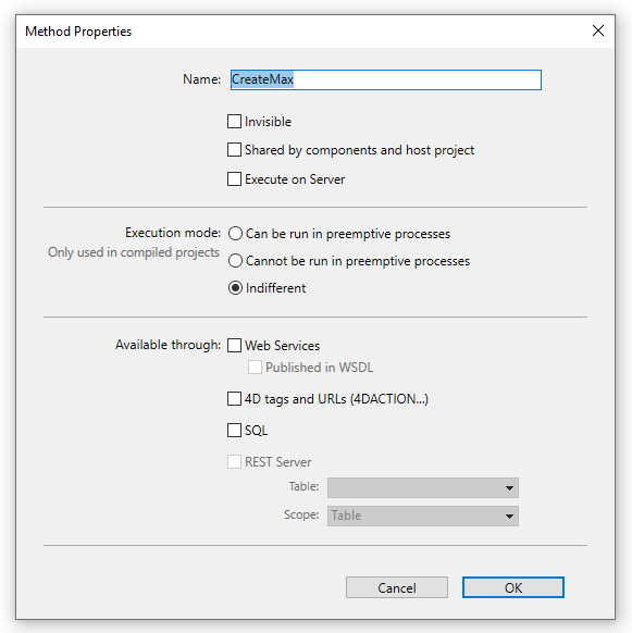 Particular case: If the method has also the Shared by components and host database property (see Project method properties), setting the Indifferent option will automatically tag the method as thread-unsafe. If you want a shared component method to be thread-safe, you must explicitely set it to Can be run in preemptive processes.