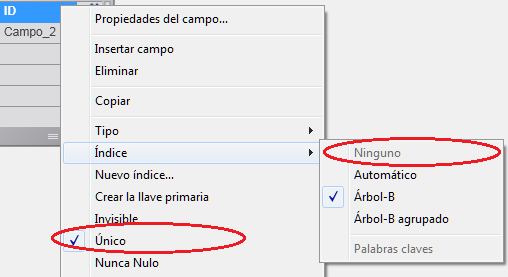 El editor no le permite eliminar el índice de un campo único (la opción Ninguno o eliminar comandos no están disponibles para los índices cuando se selecciona un campo de este tipo): Si desea eliminar el índice de un campo único, tiene que eliminar el atributo Único de antemano.