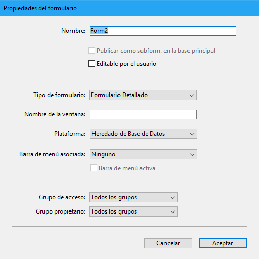 La mayoría de las propiedades en esta caja de diálogo (nombre, acceso, plataforma, etc.) también pueden definirse en la Lista de propiedades del editor de formularios y se describen en la sección Propiedades de los formularios. Sin embargo, la propiedad "Publicado como subformulario en la base local" (descrita a continuación) se encuentra en esta caja de diálogo.