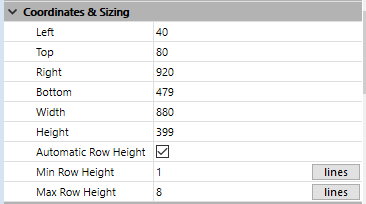 A propriedade é normalmente não marcada. Quando quiser selecioná-la para pelo menos uma coluna, as opções Min Row Height e Max Row Height são exibidas ao invés de Row Height e Row Height Array  (ver Tema de Coordenadas e Dimensões).