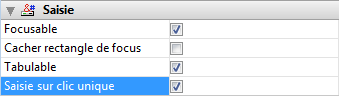 unselectablebooléenIndique si la ligne correspondante peut être sélectionnée ou non (i.e., la possibilité de la surligner). Les cellules saisissables ne peuvent plus être éditées lorsque cette option est activée, à moins que l'option "Saisie sur clic unique" soit également activée. Les contrôles tels que les cases à cocher restent fonctionnels. Ce paramétrage est ignoré si le mode de sélection de la list box est "Aucun". Valeur par défaut: Faux.