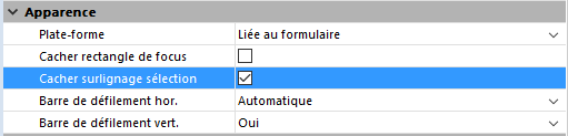 • Invisible par défaut : comme pour tous les objets de formulaire, cette option facilite la gestion dynamique de l’affichage de l’objet à l’aide de la commande OBJET FIXER VISIBLE.