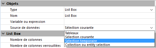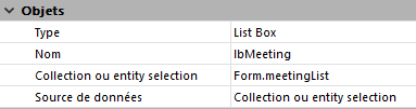 • Sélectionnez l’option Collection ou entity selection si vous souhaitez utiliser des éléments de collection ou des entités pour définir le contenu de chaque ligne de la list box. A noter que lorsque vous sélectionnez Collection ou entity selection comme Source de données, la propriété Variable ou Expression est remplacée par la propriété Collection ou entity selection.