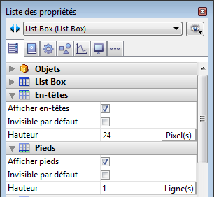 • Hauteur : permet de définir la hauteur de la ligne d’en-tête et de la ligne de pied de la list box. Vous pouvez choisir l’unité (lignes ou pixels) de la valeur de hauteur. Pour plus d'informations sur ce point, reportez-vous au paragraphe Hauteur en pixels ou en lignes ci-dessous.