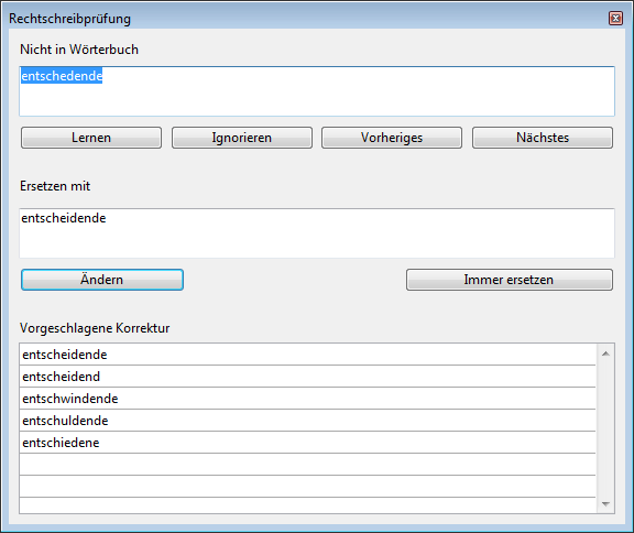 Wählen Sie die Option Rechtschreibprüfung Dialog anzeigen, erscheint ein Dialog, wo Sie eine Korrektur eingeben können: