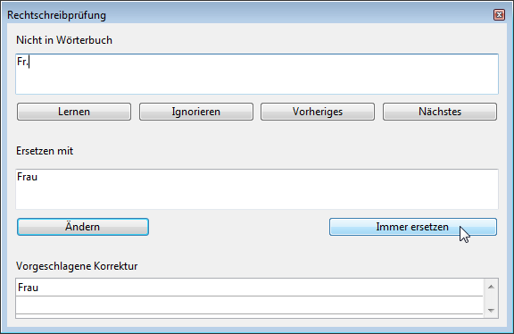 • Immer ersetzen (Dialogfenster): Funktioniert wie Ändern, das ersetzte Wort wird jedoch gespeichert (siehe unten Text Ersetzung).