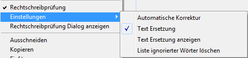 • Text Ersetzung aktiviert oder deaktiviert das Ersetzen von Text, d.h. ein Wort wird durch ein anderes ersetzt. Sie können z.B. definieren, dass "Fr" durch "Frau" ersetzt wird.