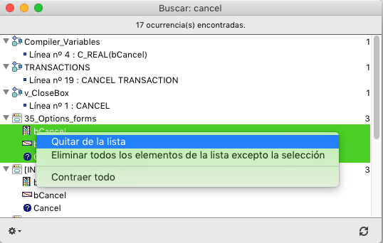 - El reemplazo se efectúa entre todos los elementos presentes en la lista y no en una selección. Sin embargo, es posible reducir la operación de reemplazo, reduciendo el contenido de la lista utilizando los comandos Eliminar de lista o Eliminar todos los elementos de la lista excepto la selección en el menú contextual: