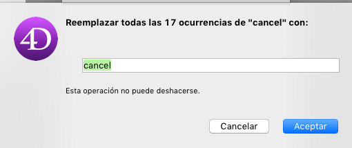 - Si un método o un formulario afectado por una operación "reemplazar en el contenido" está siendo editado por la aplicación 4D, se modificará directamente en el editor abierto (sin advertencia). Los formularios y métodos modificados de esta manera no se guardan de forma automática: tendrá que utilizar el comando Guardar o Guardar todos para validar los cambios.
