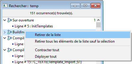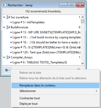 La fonction de remplacement dans le contenu permet de remplacer une chaîne de caractères par une autre à l’intérieur des objets listés dans la Fenêtre de résultat. La commande Remplacer dans le contenu est disponible dans le menu d’options de la fenêtre :