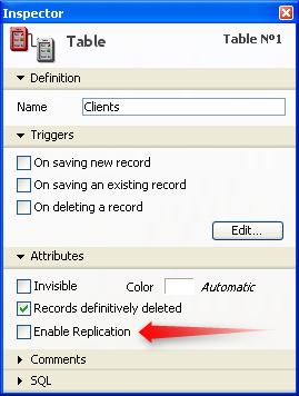 To enable the internal replication mechanism, for each table (on the remote and local database) you must use the Enable Replication table property that is found in the table Inspector: