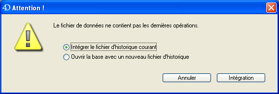 Si vous n’avez pas coché l’option d’intégration automatique du fichier d’historique dans la page Restitution du CSM (cf. Intégration successive de plusieurs fichiers d’historiques ci-dessus), une boîte de dialogue d’alerte apparaît à l’ouverture de la base lorsque 4D constate que le fichier d’historique contient plus d’opérations qu’il n’en a été effectué dans la base.
