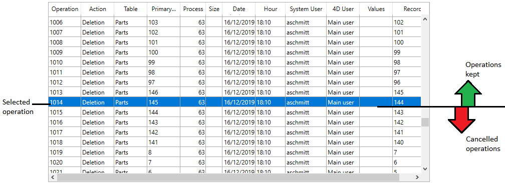 To perform a rollback among the operations, select the row after which all operations must be cancelled. The operation of the selected row will be the last kept. If, for example, you wish to cancel a deletion, select the operation located just before it. The deletion operation, as well as all subsequent operations, will be cancelled.