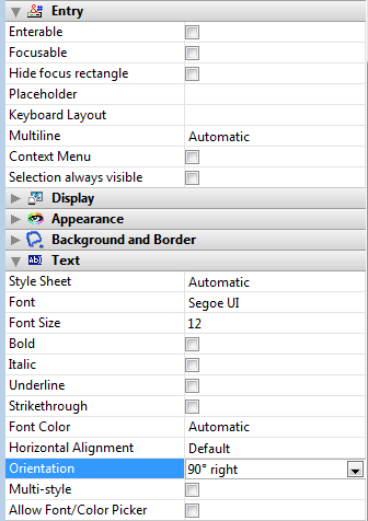 フィールドまたは変数型のオブジェクトに対して、方向のプロパティにて0°以外のオプションを選んだ場合、 入力可 とフォーカス表示のプロパティは(選択されていた場合)自動的に解除されます: