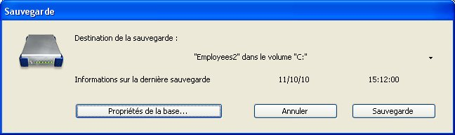 Choisissez la commande Sauvegarde... dans le menu Fichier de 4D. La fenêtre de sauvegarde s’affiche : Vous pouvez visualiser l'emplacement du dossier de sauvegarde à l'aide du pop up menu associé à la zone "Destination de la sauvegarde". Cet emplacement est défini dans la ST Get plain text des Propriétés de la base. OU Sélectionnez Centre de sécurité et de maintenance dans le menu Aide de 4D et affichez la Page Sauvegarde. Pour plus d’informations sur le CSM, reportez-vous au chapitre Centre de Sécurité et de Maintenance. Le bouton Propriétés de la base... provoque l’affichage de la boîte de dialogue des Propriétés de la base (page DOM REMOVE XML ATTRIBUTE).