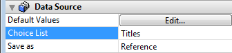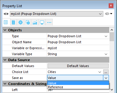 The Save as Value/Reference option is found in the "Data Source" theme for Field and variable objects, Pop-up Menus/Drop-down Lists as well as list box columns (see List box column specific properties):