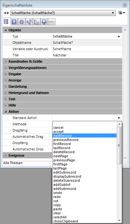 Sie erzeugen eine Schaltfläche durch Auswählen des gewünschten Schaltflächentyps in der Dropdown-Liste Typ. Anschließend wählen Sie in der Dropdown-Liste Standardaktion die gewünschte automatische Aktion aus (siehe Standardaktionen):