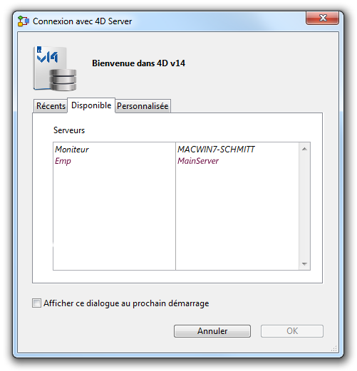Si vous cochez l'option Afficher ce dialogue au prochain démarrage, cette boîte de dialogue sera automatiquement affichée au démarrage de l'application 4D.
