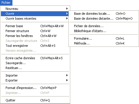 • via le sous-menu Ouvrir bases récentes (fichier placé dans le dossier de préférences local).