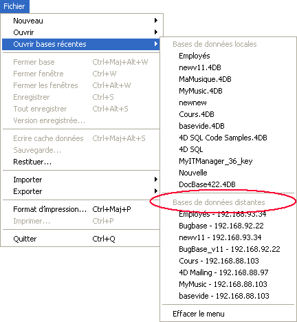 Cette commande est située dans le menu Fichier de 4D. Si vous utilisez l'application 4D pour vous ouvrir des bases locales et pour vous connecter à des bases distantes, le menu liste les deux types de bases. Les bases distantes sont situées en bas du menu :